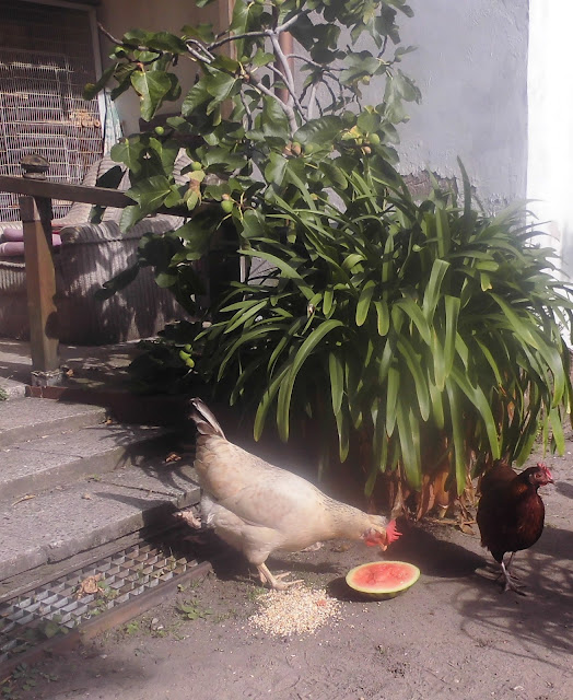 Melone muß einfach sein, denn Hühner lieben Melone! Braunchen ist durch mein fotografieren abgelenkt.